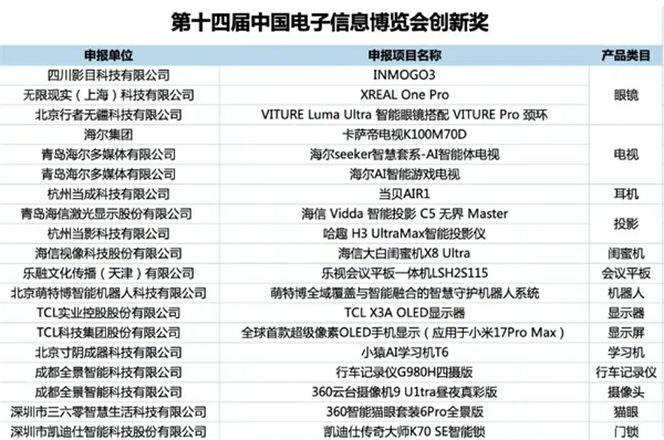 大会最后揭晓“中国电子信息博览会创新奖”榜单。中国电子视像行业协会名誉会长郝亚斌、中国电子信息博览会秘书长陈雯海为获奖企业代表颁发证书。该奖项由中国电子信息行业创新评选组委会联合专家学者、协会、媒体等权威人士和机构评选,旨在致敬产业创新者,推动我国电子信息行业创新水平提升。