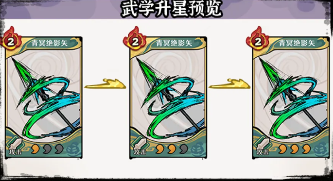 真气恢复机制稳定——每回合开始自动回复1点,保障技能释放频率。其专属卡牌体系采用怒气驱动设计:1星卡牌消耗2点怒气,造成攻击力200%的外功伤害,每次使用后触发进化,额外附加30%攻击力的外功伤害,且该进化效果可循环叠加;