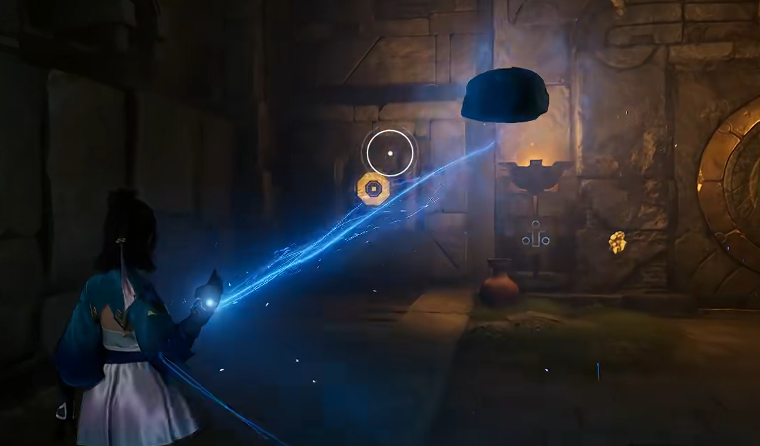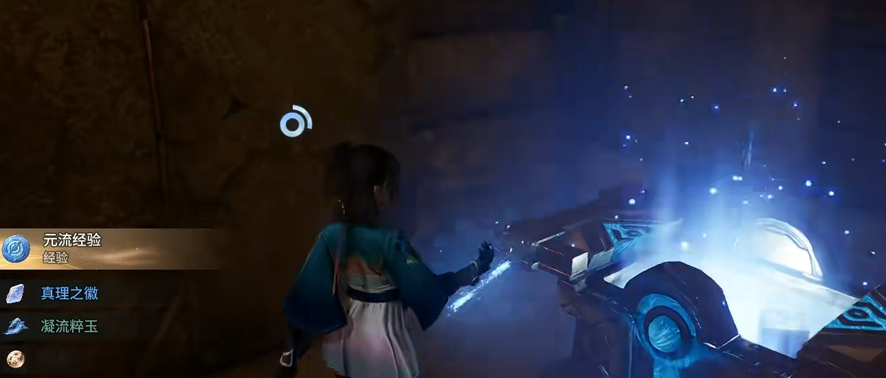 操作策略如下:先同步开启三个圆盘开关,启动机关令小球升至中段并卡停;随后关闭中间圆盘,使小球受重力作用滑落至左侧宝箱位置,完成最终解锁。开启宝箱获取全部资源后,使用钩索锚定宝箱顶部结构,即可安全撤离密室。