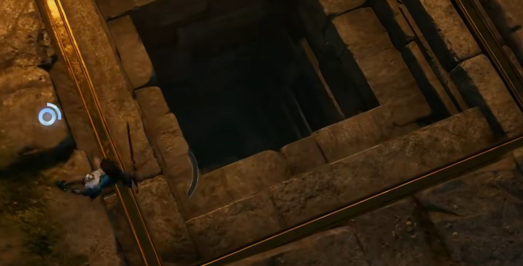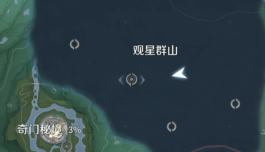 该地下入口位于观星群山地图中已标出的位置(见上图)。抵达洞口后,需使用普通攻击依次激活左右两侧的机关装置,方可解除封印、开启通道。进入后可直接从洞口纵身跃下至底层空间;途中所见中央石门为静态布景,不具备交互功能,无需尝试开启。