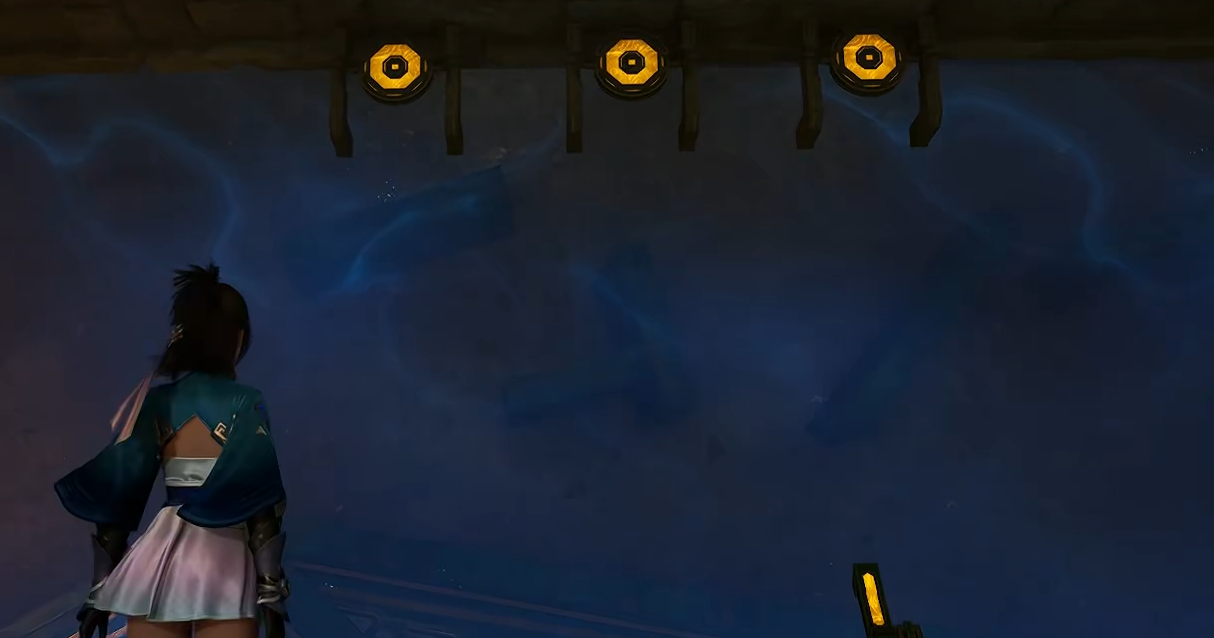 落地后可见四枚可拾取球体及一个中央机关台。务必先收集全部球体,随后启动机关,持球依次击打对面四个金属盘。完成一轮完整命中后,中央巨型石门将自动开启,门后藏有一个宝箱。需注意:密室同步触发注水机制,水面将逐步上升。