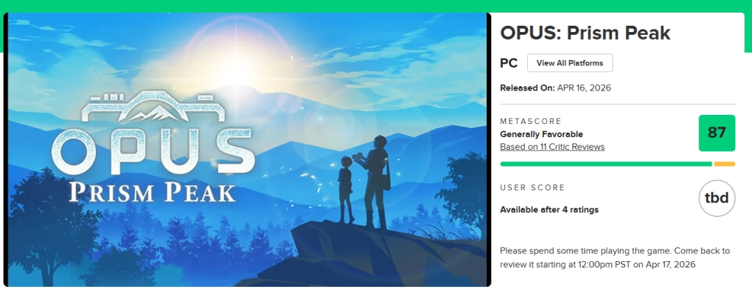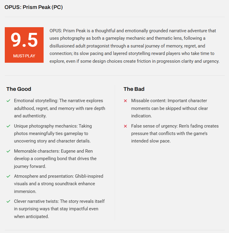 《OPUS:心相吾山》是一款会让你目不转睛的叙事冒险游戏。它拥有新海诚式的视觉美学、富有意义的摄影玩法以及引人共鸣的角色,你根本不想离开暮光之地。总的来说,我认为《OPUS:心相吾山》是一款不容任何人错过的游戏。如果你喜欢没有高压情节的叙事冒险游戏,又欣赏将摄影机制运用得当的作品,那么它就是你的不二之选。