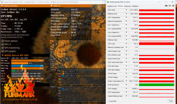 在室温21℃的环境中,使用Furmark连续烤机30分钟后,默认考机功率可以跑到250W,此时GPU温度为62.5℃,显存温度为58℃。考虑到该显卡的散热规模,这样散热表现相当不错~此时风扇的转速保持在1500RPM左右,风扇噪声很小,安静创意无限!