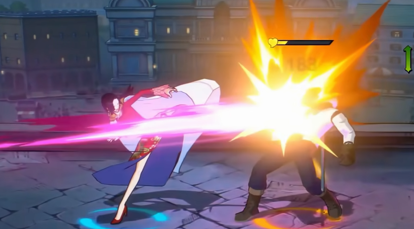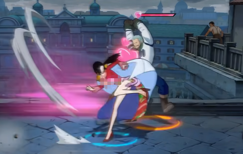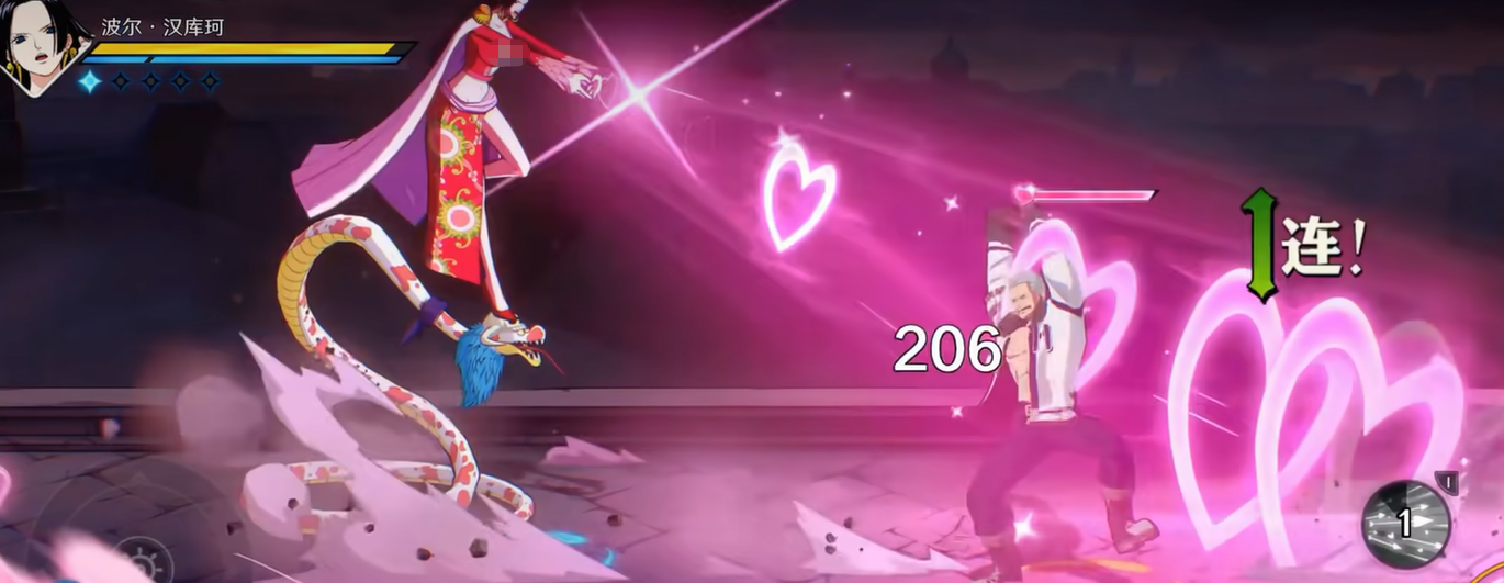 第二个被动比较特殊,除了路飞以外的角色,跟女帝面对面站着的时候,头上会有个进度条。进度条满了之后,会进入三秒的花痴状态,这时候就可以直接冲过去打连招。敌人转身或者离开视野范围的话进度条会慢慢减少。