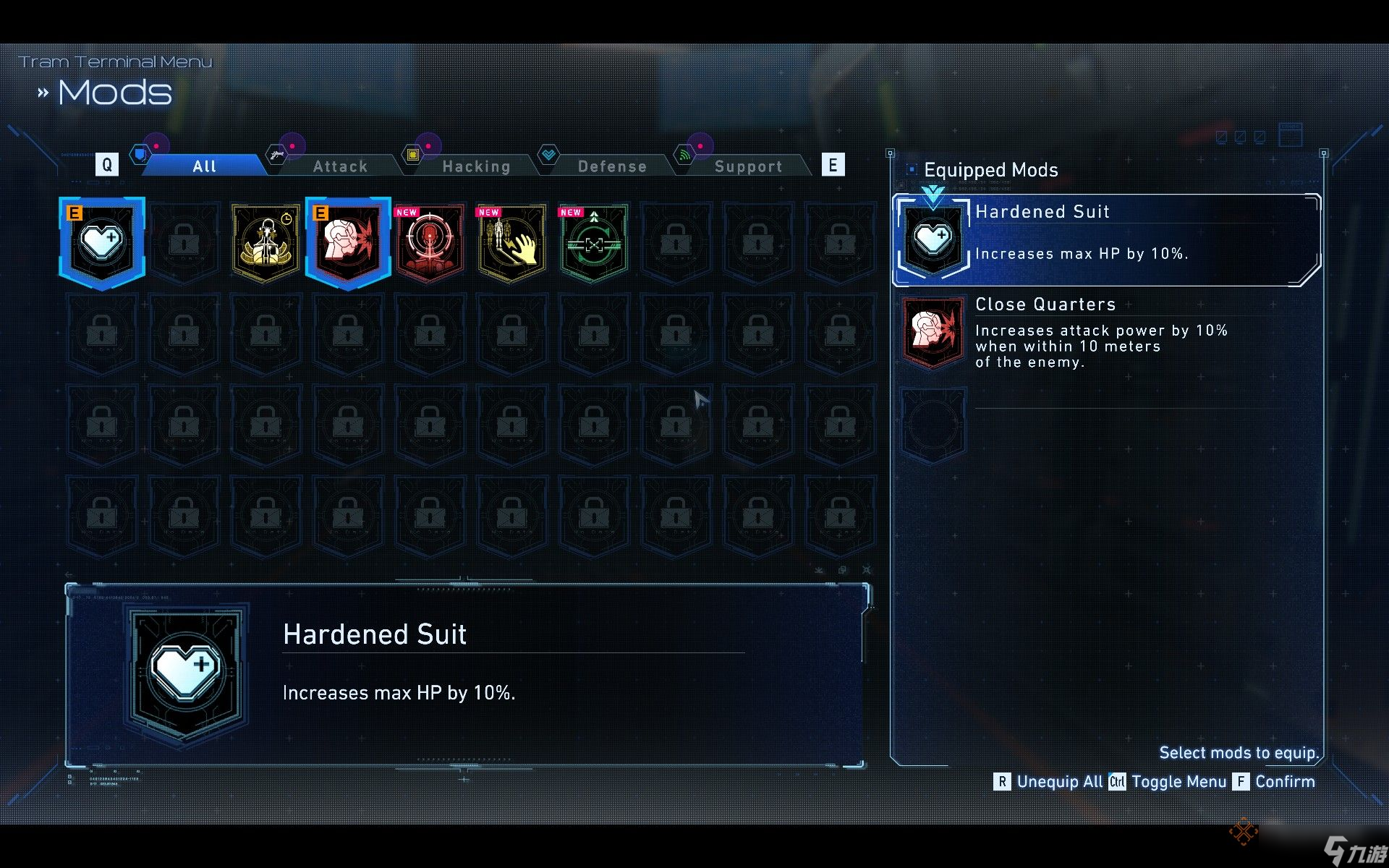载入界面的下一部分是模组(Mods),它们为休提供各种属性加成。模组分为攻击、黑客、防御和支援四种类型。游戏中有数十种模组,请多加尝试,寻找最适合你的组合。