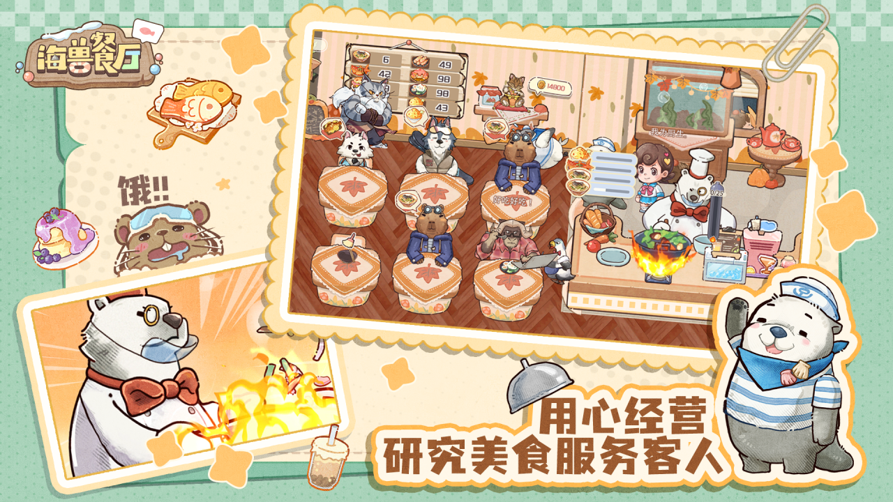 员工系统以拟人化海兽为核心,构成另一大特色模块。北极熊担任主厨、海豹负责店内服务、企鹅承担外卖配送——所有岗位均由可养成角色担任。玩家需通过羁绊互动持续提升亲密度,从而解锁专属技能、提高工作效率及整体收益水平,实现角色成长与经营效益的双重绑定。