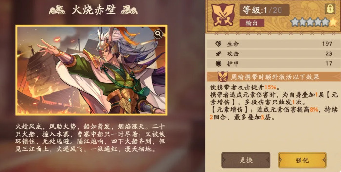 大家也可以从大招看出来,他的天赋基本都是围绕着必杀技的机制来进行触发的,所以在有这两者进行搭配的情况下,前期开荒有他大家就一点都不用担心输出,中后期也可以用他的这类能力带来群体的效果,后期参与副本以及PVP当中,他的发挥能力都是非常不错的,想要为他的自类能力来搭配溯影的情况下,首选的就是火烧赤壁,火烧赤壁的天赋是非常适合周瑜的能力,可以为他带来攻击上面15%的提升,而且在终于造成了火元素伤害的时候,还可以为他叠加一层元素真伤的功能,在多段伤害当中,虽然只触发一次,但是这里一次的提升伤害就达到了8%的元素效果,而且两个回合的时候,他最多也可以叠加到3层,所以这里的加成数值是非常可观的。