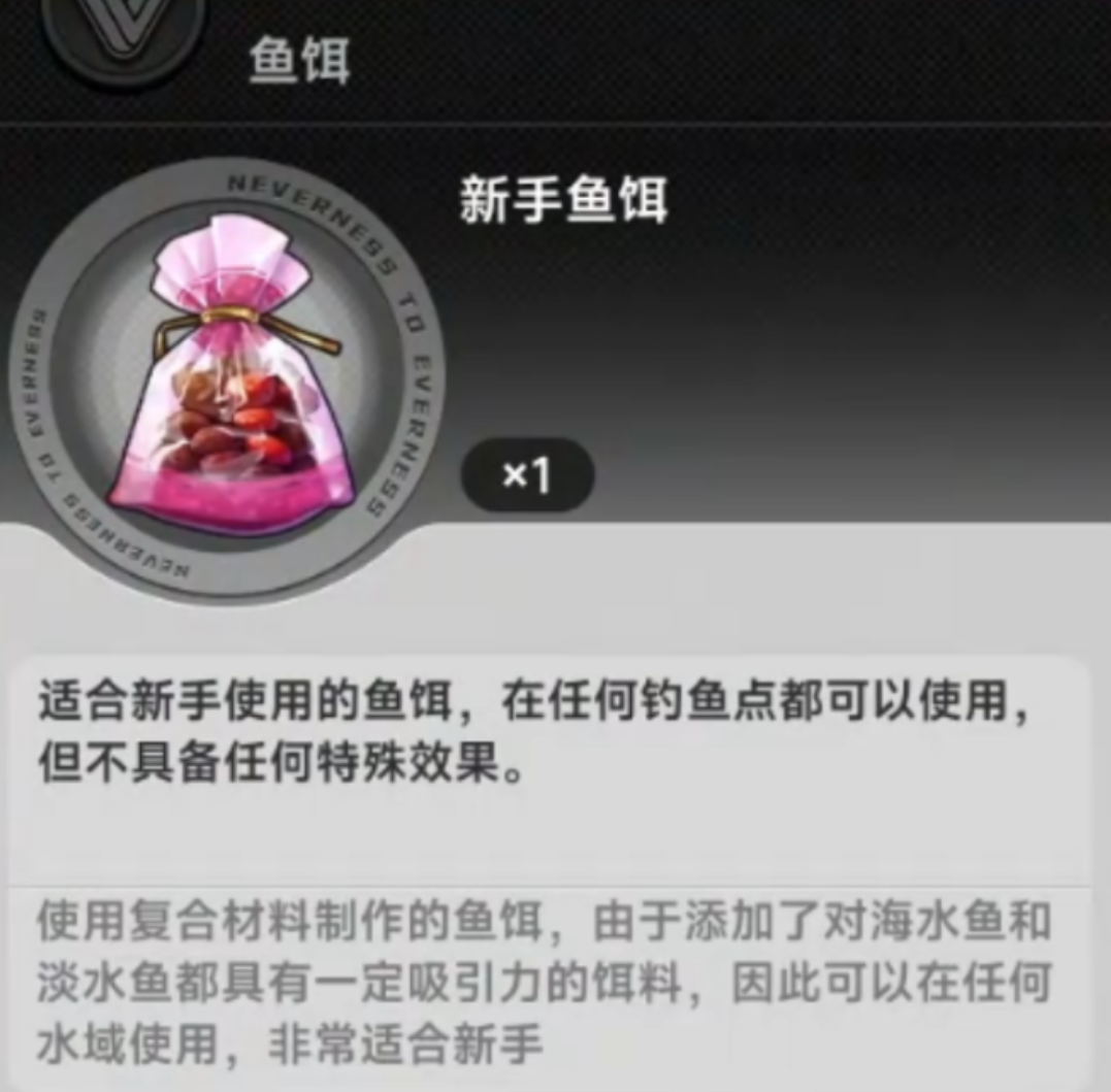 初始阶段(钓鱼技能等级0-2):系统自动授予【通用基础饵】。该配方采用低门槛材料组合,适配全水域环境——包括淡水湖泊、沼泽浅滩及近海过渡带。无需考虑潮汐周期、光照强度或鱼类活动热区,投饵即有稳定咬钩响应。此设计旨在降低新手学习成本,让玩家快速建立操作反馈闭环。
