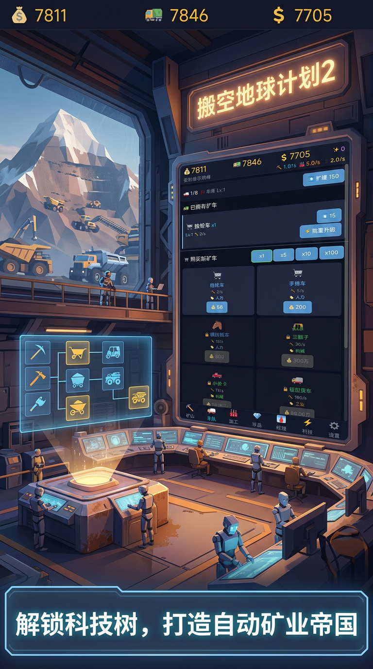 一款放置向矿业模拟游戏!从一台小矿机起步,逐步建立庞大的挖矿舰队,攻克科技树,雇佣经理人实现全自动化生产,最终搬空整个地球!离线也能持续收益,随时回来查看你的矿业帝国。