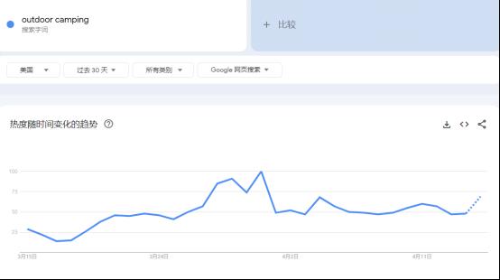 打开Google Trends,就能看到美国近一个月户外露营的搜索量在开始增加了。