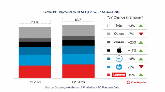 与存储市场的暴涨形成对比的是,全球PC出货量呈现小幅同比增长。数据显示,2026年第一季度全球PC厂商出货量达6330万台,较去年同期的6140万台增长3.2%。从厂商表现来看,多数厂商出货量实现增长,其中苹果和华硕表现亮眼,分别以11%和20%的同比增幅领跑行业;戴尔和联想出货量同比分别增长8%和9%;与此同时,惠普及中小型PC厂商出货量出现下滑,分别同比下降5%和7%。