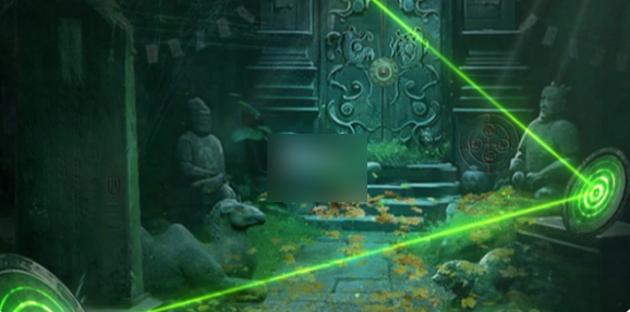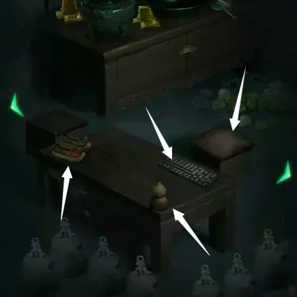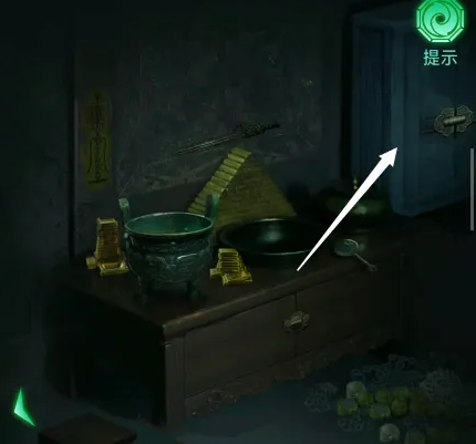 9、根据金饼信息,加上最左边墓室筷子上的红色“木”,写着蓝色“火”的青铜鼎,写着蓝色“香土”的陶罐,以及另一边墓室的写着绿色“水”字的玉簪,可解开主墓室左边的密码,停止射箭。