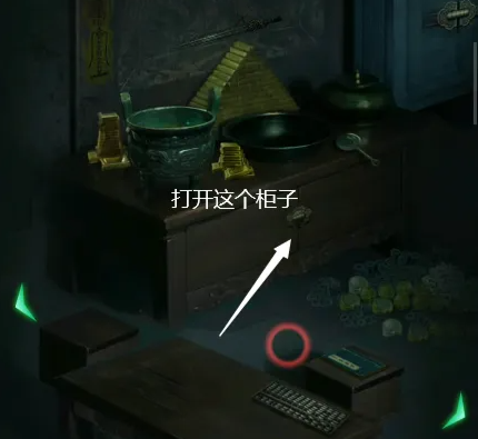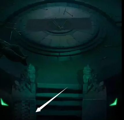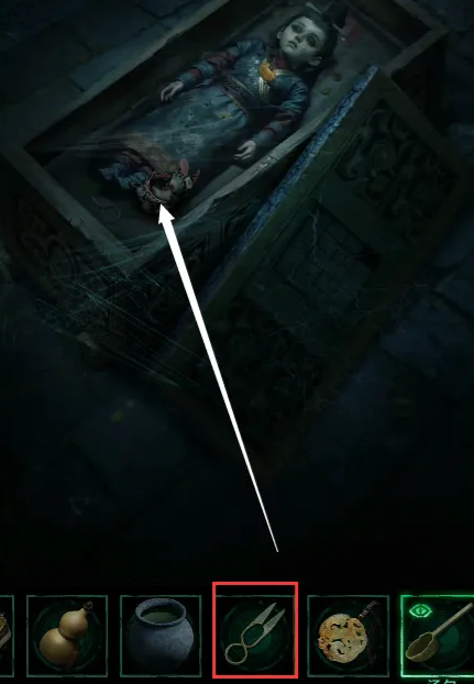 10、 根据之前获得的“禄寿福喜”顺序,解开左边柱子的密码,棺椁下降,使用烧红的剪刀剪开蛛丝,使用宝剑打开第一个棺。