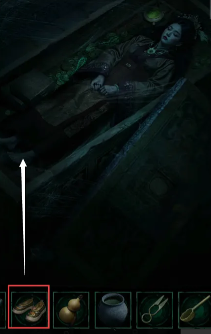 5、使用剪刀剪开第一个棺脚下的玩偶,获得玉佩和汤勺,使用玉佩打开第二个棺,把绣花鞋给女士穿,获得鸳鸯戒指,女尸头上有一个玉簪,上面有一个绿色的“水”字。