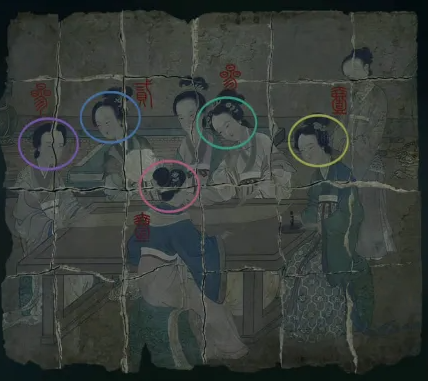 6、女尸脚下有一个箱子,根据第一个棺内小孩脖子上的“儿孙满堂”打开箱子获得一张女子画像,使用酒浇在画的右下角,获得“四四二十五”的信息。
