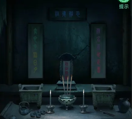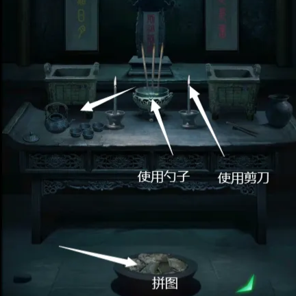 7、最左边的墓室,地上有火盆,点击火盆完成拼图,获得不同的颜色和数字信息,使用勺子在香炉上取一把香灰,把香灰倒进茶壶里,获得装满香灰水的茶壶,使用茶壶把香灰水倒进杯子里,再次获得四字密码“禄寿福喜”,使用剪刀在烛台上烤获得烧红的剪刀。