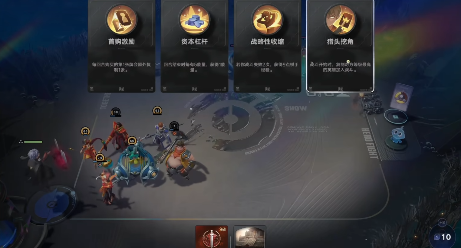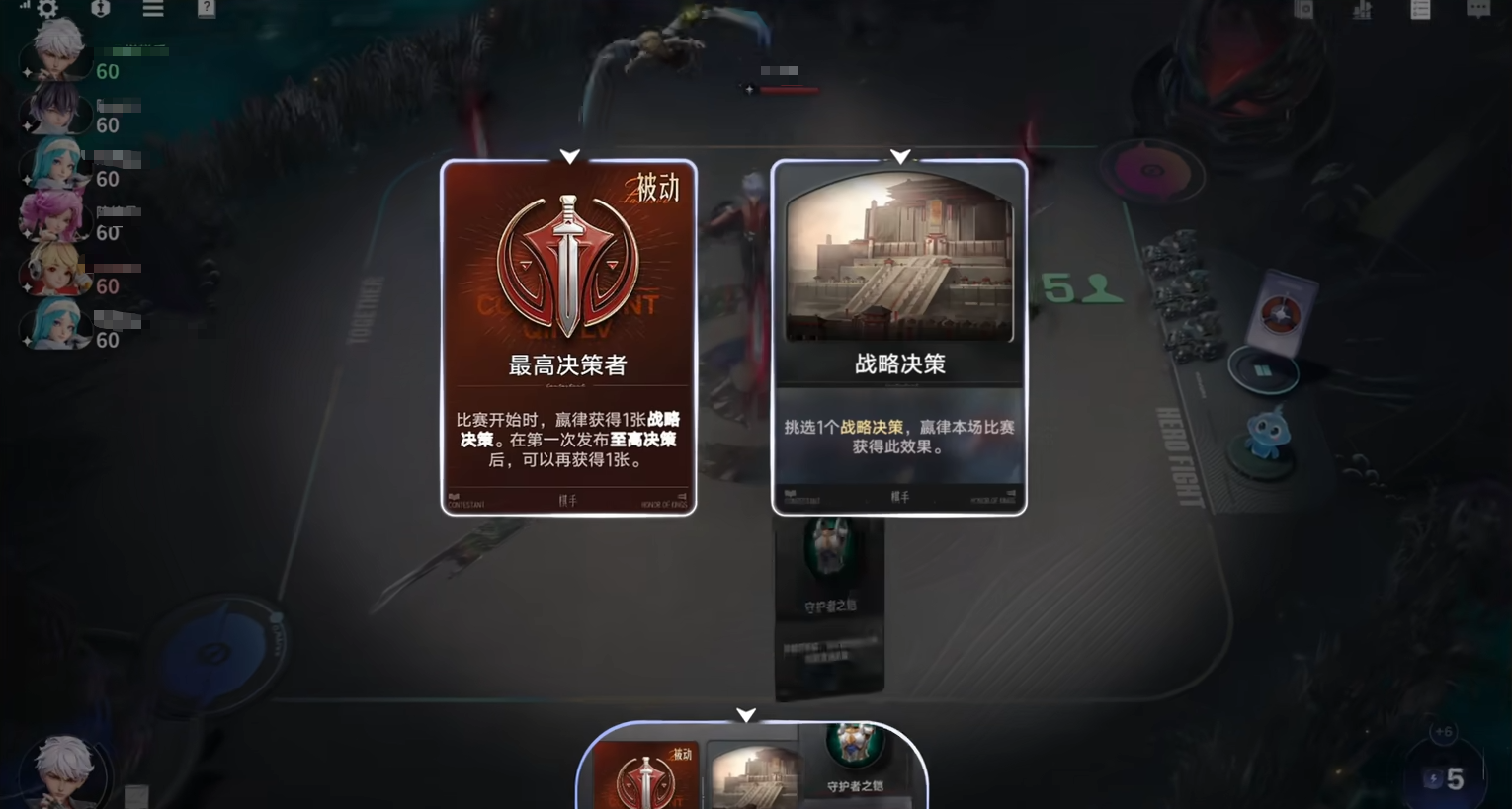 嬴律的棋手技能名为“最高决策者”。对局初始即自动获得1张专属手牌——“战略决策”,使用后可从若干随机选项中择一启用,效果全程持续至终局。可选方向包括:能量获取效率提升、经验转化率优化、场上己方英雄战力强化等关键维度,为整场对战奠定策略基调。