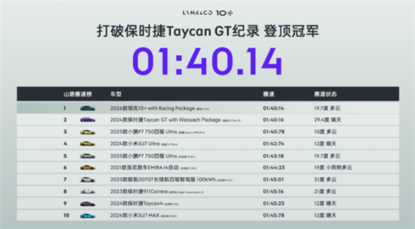 与此同时,领克10+此前以1分40秒14的成绩,成功超越保时捷Taycan GT,刷新亚洲山脊赛道圈速纪录。