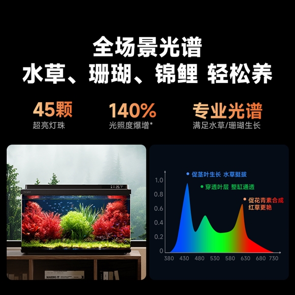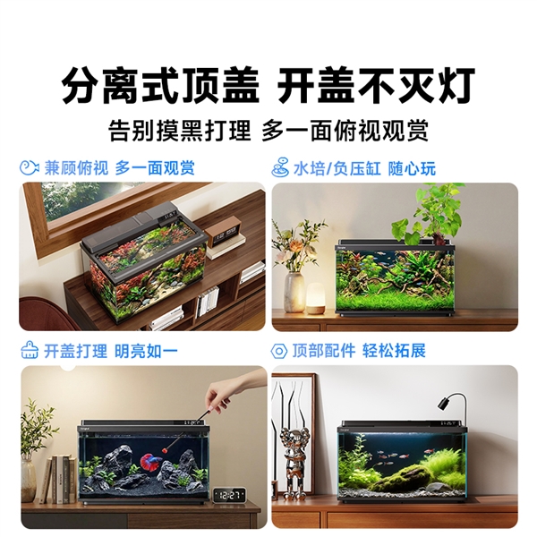 最硬核的升级当属灯光系统:45颗高亮全色域灯珠把亮度直接推高140%,多种专业光谱一键切换——南美溪流、深海月夜、珊瑚正午……想拍大片,灯先给你打好光。首创45°影棚式布光,让水草更绿、鱼体更艳、景深更立体;开盖也不会灭灯,俯视喂鱼、修剪水草照样亮如白昼。一句话,把“照明”干成了“摄影灯”,观赏级发色只是顺手,轻松养活娇贵水草跟珊瑚才是正经事。