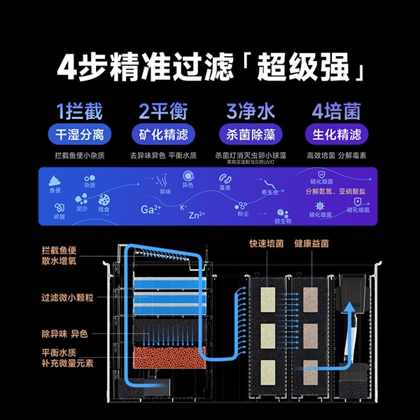 双泵双过滤系统采用专利干湿分离技术与四层精准过滤结构,6500ml 超大过滤仓容纳更多滤材,层层净化水质,先拦截鱼便、残饵等大颗粒杂质,再矿化水质、去除异味,选配 UV 灯抑制藻类、杀灭有害菌,最后通过3D纳米陶瓷砖培养硝化细菌,分解氨氮、亚硝酸盐等有害物质,双层干湿分离有效降低维护成本,还支持DIY翻水板与滴流盒拓展,满足不同玩家的使用需求。睡眠级静音双水泵采用陶瓷轴芯,运行噪音低于30dB,双泵稳定运行形成环流,提升水体溶氧,安静不打扰日常生活。