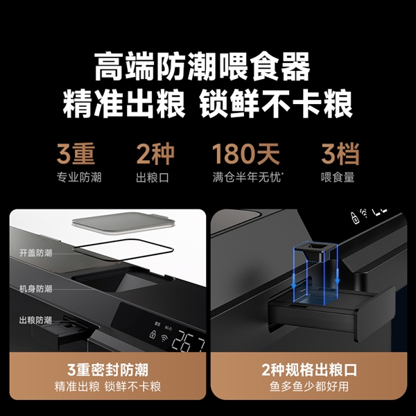 搭配全新推拉式智能防潮喂食器,采用三重防潮设计,机身、出粮口、喂食口全方位防潮,满仓可续航 180 天,同时配备双规格出粮口,能精准适配大小不同鱼种,喂食量支持三档可调,再搭配 APP 远程定时控制,即便出差加班也能安心养鱼。