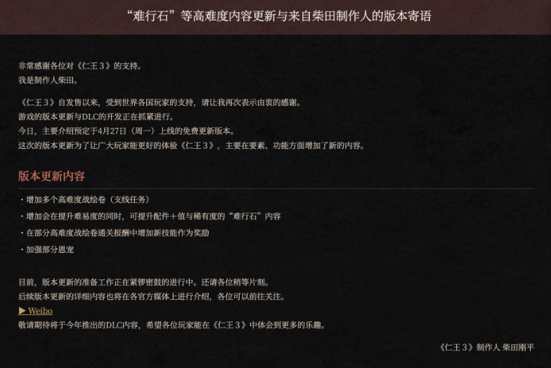 光荣特库摩旗下动作游戏《仁王3》制作人柴田刚平今日(4月20日)发布寄语,宣布游戏将于4月27日(周一)推送免费更新。本次更新将重点增加高难度挑战内容及多项新功能,以进一步提升玩家的游戏体验。