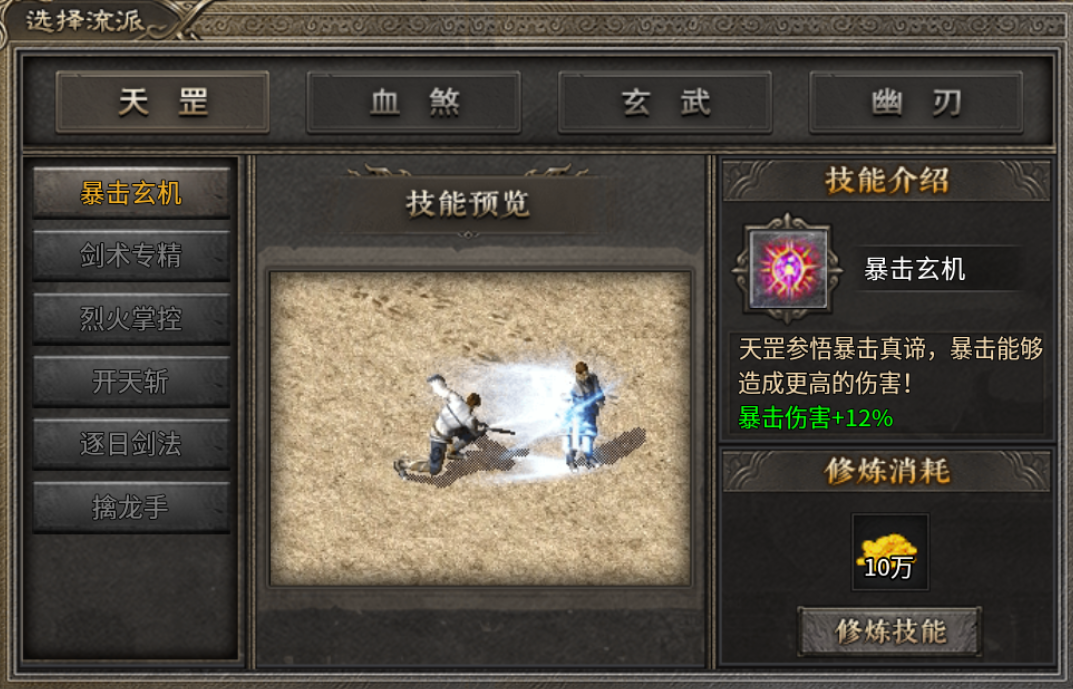 天罡:爆发型战士,使用开天斩逐日剑法对人造成致命一击