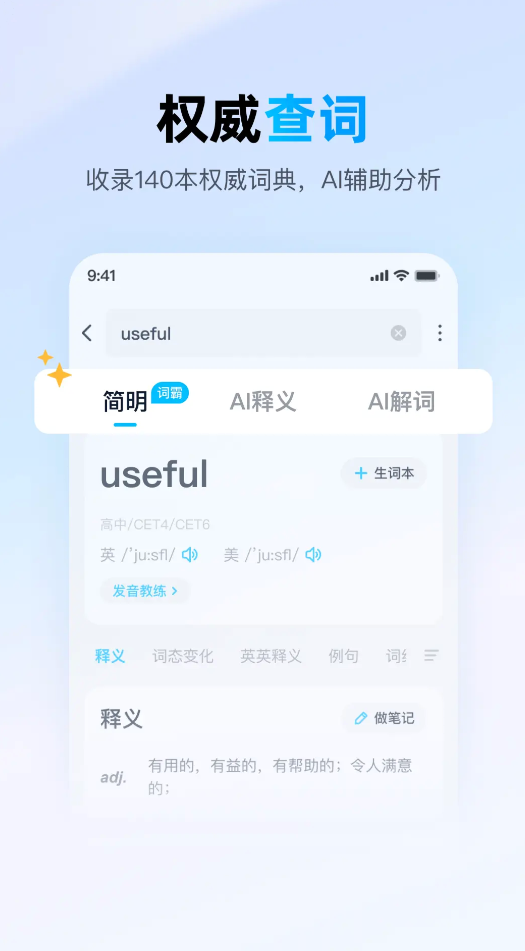集成拍照取词、语音输入、手写识别等多种查词方式,支持多语种互译及离线词库下载,断网状态下仍可完成核心查词与翻译任务。面向不同学习阶段用户提供定制化服务,涵盖高中英语、四六级、考研英语、雅思托福等考试体系,支持个性化学习路径规划与进度同步。内置真题数据库,覆盖历年主流考试题目,并配备名师解析视频与考点大数据分析报告。