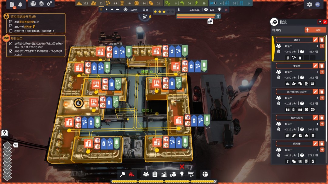 玩家要尽可能建立高效的“纵向”传输网络,确保资源能在各层间飞速流转,人员行动顺畅,以达成目标。