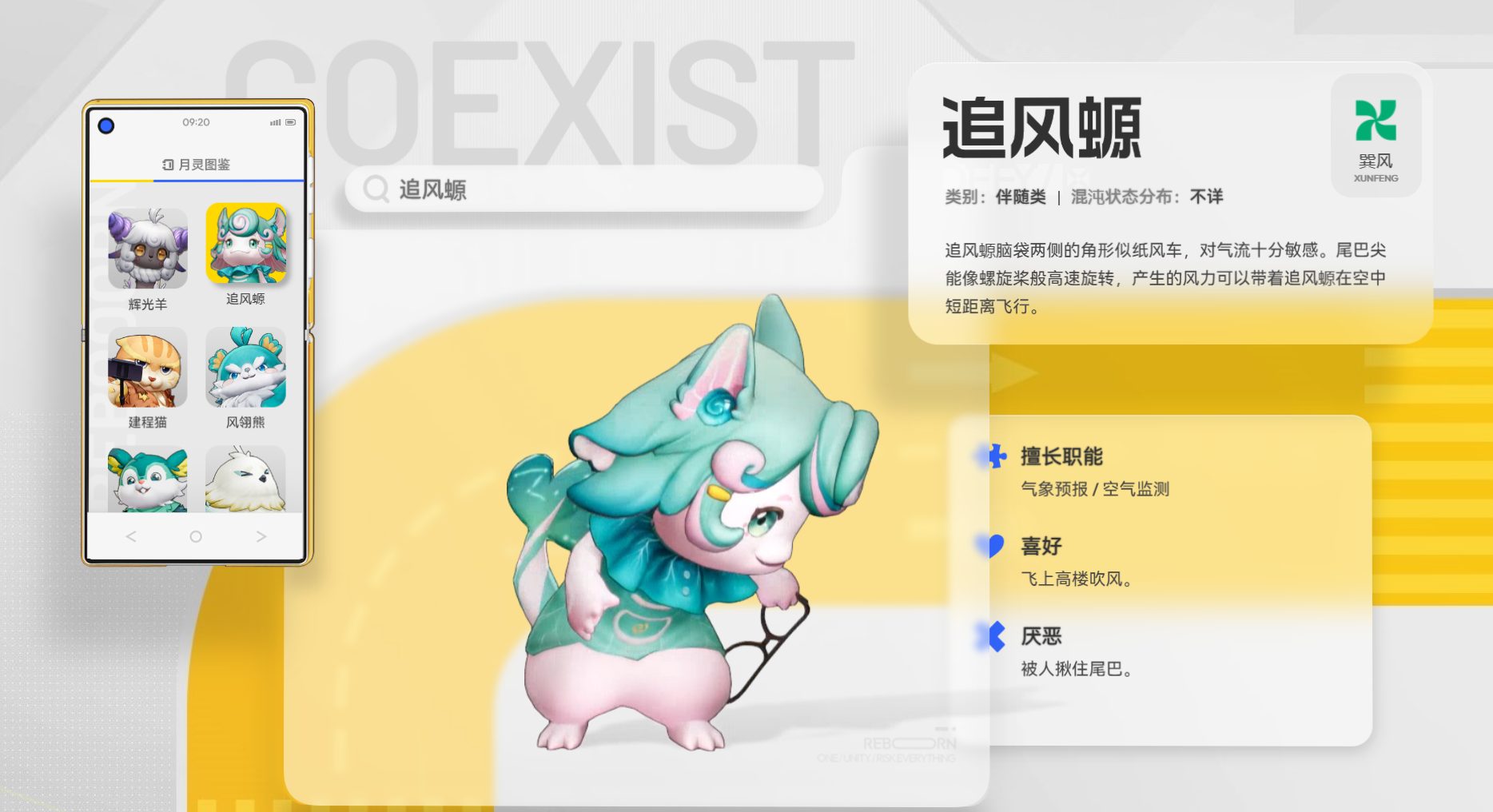追风螈具有巽风属性,头部两侧有纸风车形状的角对气流很敏感,尾巴尖能像螺旋桨一样高速旋转,使自己产生短距离飞行的效果。主要功能就是对天气和空气质量进行实时预报、监测,给玩家提供出行前的天气状况、空气质量情况等信息,便于玩家出行。追风螈喜欢飞上高楼吹风,享受气流拂过的感觉,但是十分讨厌被人揪住尾巴,玩家在互动的时候要保持一定的距离,尊重它的生活习性。