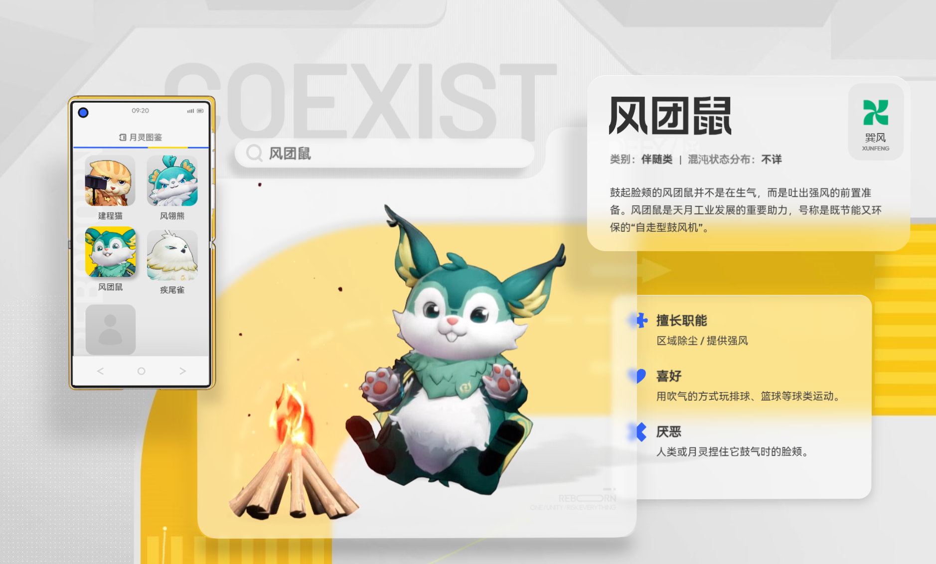 风翎熊和风团鼠虽然体型、习性不同,但是都和“风”有着不解之缘,在各自的领域里起着重要的作用。风翎熊形似羽毛球,运动天赋出众,被选为比赛场务和运动陪练,常以圆滚滚的形象出现在玩家面前,担任体育赛事的代言人。风团鼠被称为自走型鼓风机,鼓起脸颊吐出的强风可以用于区域除尘和工业助力,是天月市工业发展的合作伙伴,它还喜欢用吹气的方式玩球类运动,但是非常讨厌人类或者月灵在它鼓气的时候触摸它的脸颊,玩家需要避开这个雷区。
