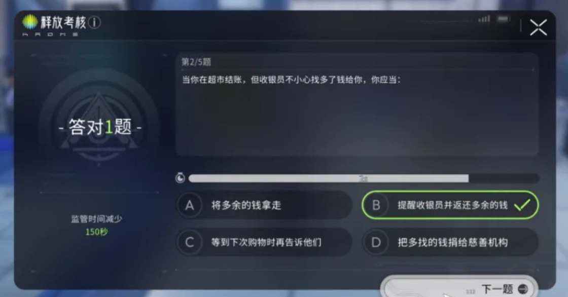 为了重新获得自由,玩家要经过“释放考核”,从而缩减监管时间。这是种非常有特色的游戏,考核内容一般为交通法规、社会常识或者道德判断等内容。系统会询问“当收银员多找了一块钱应该怎样处理”,只有玩家做出正确的道德选择或者回答正确才能减少剩余的监管时间。寓教于乐的惩罚方式既减轻了被关押者的挫败感,又增加了游戏的趣味性,在“坐牢”的同时也能体会到别样的乐趣。