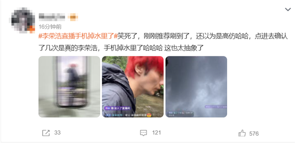 据多位网友发布的视频画面显示,李荣浩将手机架在水边石头上进行直播,受风力影响或操作失误,手机突然滑入水中,画面从仰拍天空骤然黑屏,直播被迫终止。