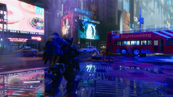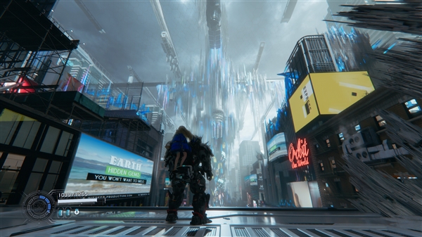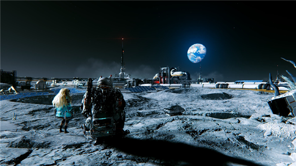 作为一款科幻题材作品,《识质存在》的画面表现可以称为是卡普空在3A视觉呈现上的又一次突破。在自研RE引擎的深度优化与NVIDIA DLSS 4技术、路径追踪技术的加持下,月球基地的科幻质感与光影层次直接拉满。游戏构建的科幻景观极具特色,人类利用月球“月矿”制造的“月纤”材料,可3D打印出地球的建筑、植被,形成地球原生态与太空科技相融合的独特景观,如在第二章,玩家就能前往在月球上复刻的纽约时代广场:霓虹灯管散发着的光晕,与冰冷的太空舱壁、金属支架形成强烈反差;熟悉的广告牌、路灯被月纤材质重构,表面泛着淡淡的荧光,搭配远处地球的蓝色轮廓与漫天星辰,这种陌生的科幻场景与熟悉的城市元素碰撞,带来极具冲击力的视觉张力。
