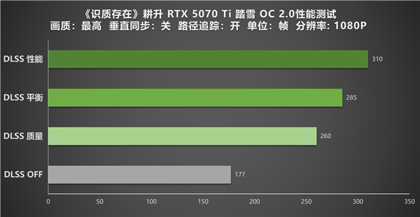 在1080P分辨率的测试中,耕升GeForce RTX 5070 Ti 踏雪 OC 2.0在原生渲染模式下,能跑出平均177帧的流畅帧率。开启 DLSS 4质量模式后,帧率跃升至260帧;平衡模式进一步拉到 285 帧;性能模式下更是直接冲到 310 帧,实现了近乎翻倍的性能提升。从原生到性能档,帧率提升幅度高达75%,让玩家在光追拉满的场景下,依然能获得极致流畅的游戏体验。