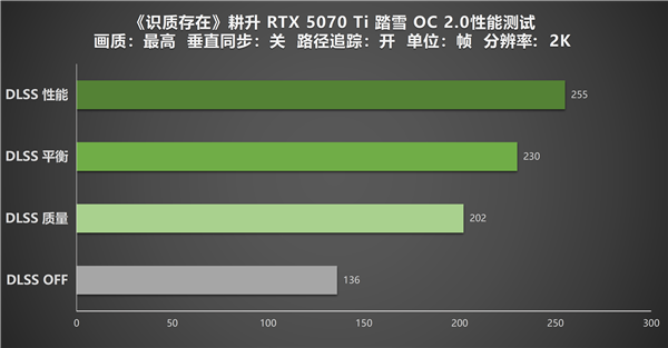 在2K分辨率中,耕升GeForce RTX 5070 Ti 踏雪 OC 2.0 在最高画质、路径追踪全开的高负载环境下,依然展现出了强劲性能实力。原生渲染模式下,显卡能跑出 136帧的流畅表现,基础光栅性能在线。开启 DLSS 4质量模式后,帧率直接提升至 202 帧;平衡模式下帧率进一步上涨至230帧;性能模式则直接冲到255 帧,相比原生帧率提升了一倍。可见在2K+路径追踪拉满的严苛场景下,DLSS 4 技术的加持,能让玩家轻松驾驭2K超高刷的流畅体验。