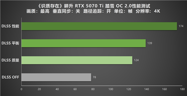 最后是最为考验显卡实力的4K分辨率,实测中,耕升GeForce RTX 5070 Ti 踏雪 OC 2.0 展现了 NVIDIA DLSS 4技术带来的巨大增益。4K原生渲染下,显卡也能输出78帧的流畅表现,性能实力令人满意。开启 DLSS 4后,高分辨率与路径追踪的双重性能压力得到了完整释放:质量模式的帧率直接跃升至 124帧,实现画质与流畅度的双突破;切换至平衡模式,帧率进一步提升至139 帧,完美平衡画面流畅度与画面质量;而开启性能模式时,帧率直冲174帧,画面流畅度再上台阶。