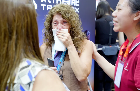 半小时后,在同伴与工作人员的搀扶下,她艰难起身,穿戴好外骨骼设备。这位已失去正常行走能力的女士,在设备的辅助下重新“站”了起来,并缓缓迈出了几步。