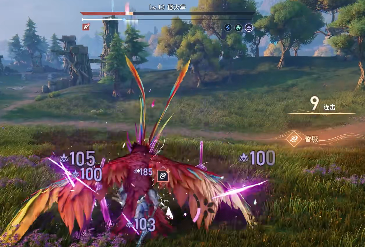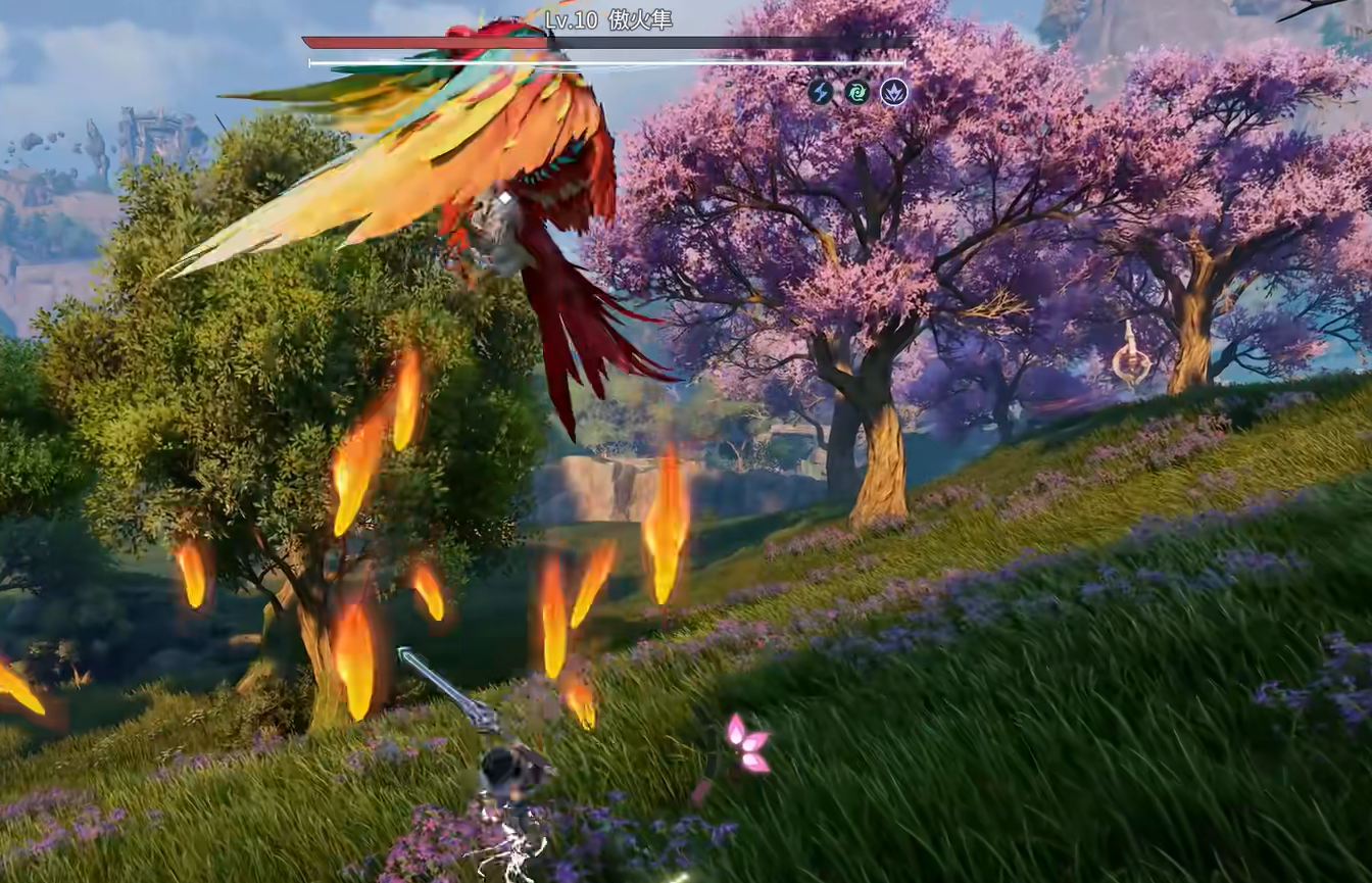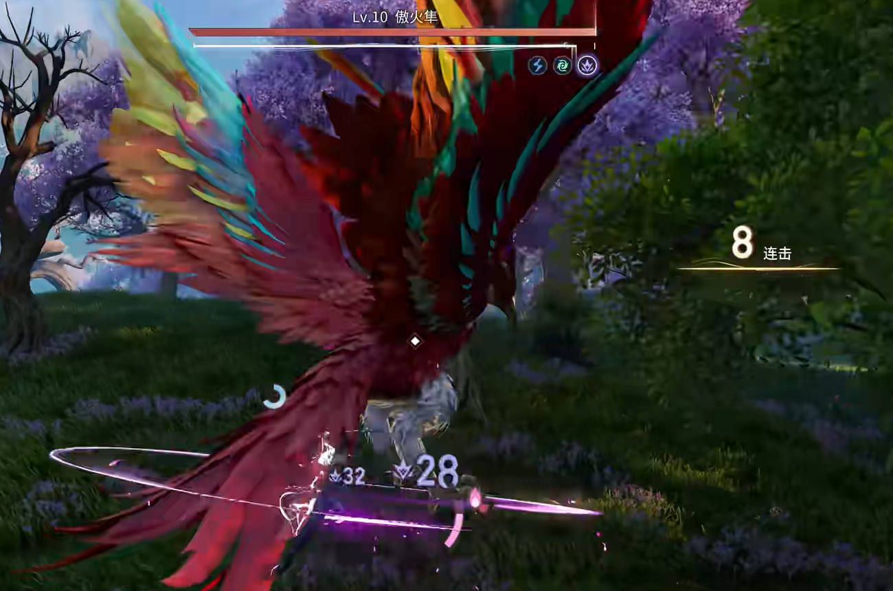 成功使其陷入昏厥后,可立即发动上段斩击接续重击,快速堆叠连击数。当连击累计达到破势处决触发阈值,即可衔接抓取类终结技,打出高额附加伤害。一轮完整连招结束后,傲火隼剩余血量通常已不足三成。随后它将升空扇动双翼,投射多枚燃烧羽刃,并在地面生成持续灼烧区域。玩家须迅速横向位移脱离火焰覆盖区,同时注意其接下来将执行向左旋转360度动作。