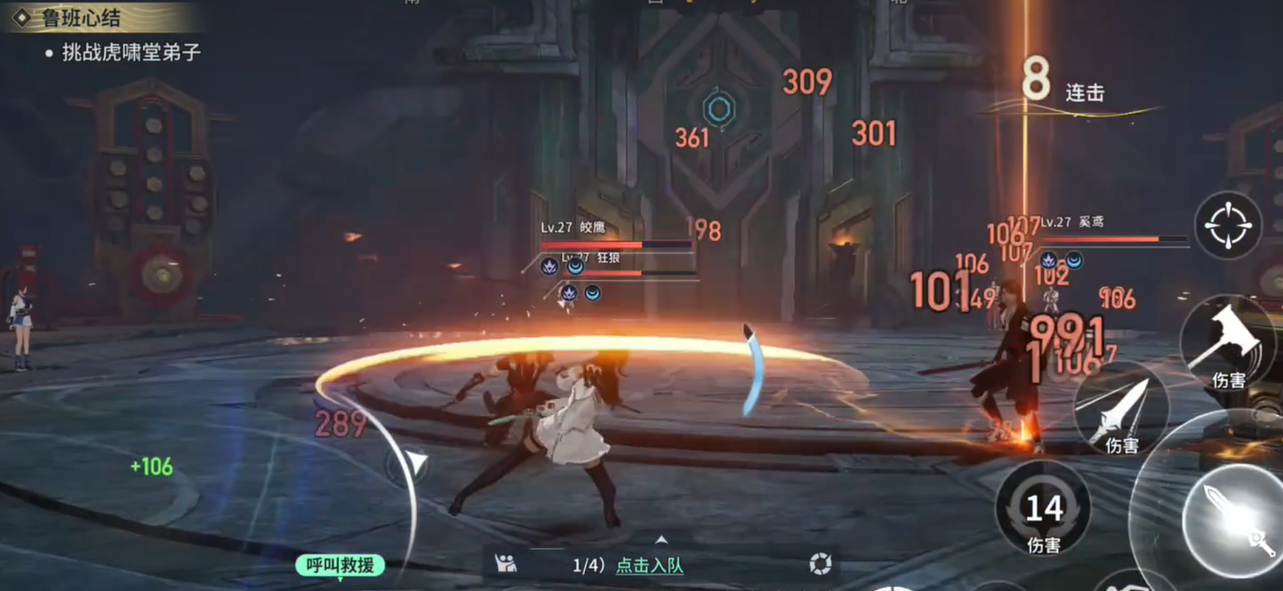 上去之后,就会碰到虎啸堂弟子,这里是真正的挑战。如果打不过,可以喊好友一起来。没有固定队友也没关系,界面上有个呼叫功能,可以招陌生玩家帮忙。