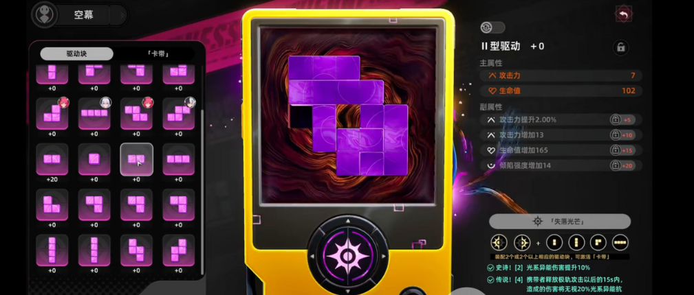 拼放的部分,可能是空幕系统里,最需要动脑筋的地方了。卡带和驱动在放置的时候,有点像俄罗斯方块,要拼凑成没有缝隙的状态,这样才能把属性吃满。而且卡带的颜色,还要跟驱动的颜色相近,搭配不对的话,效果也会打折扣。刚开始自己摸索可能会放得乱七八糟,不过后面熟悉了,或者直接照着别人的摆法来,其实不难。