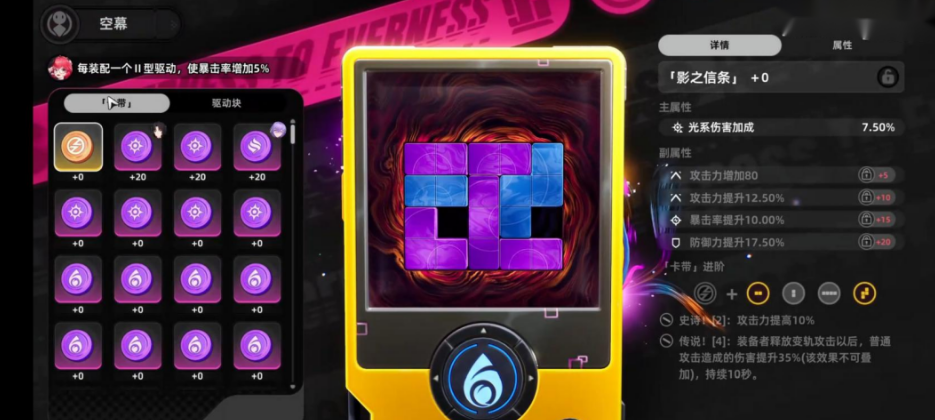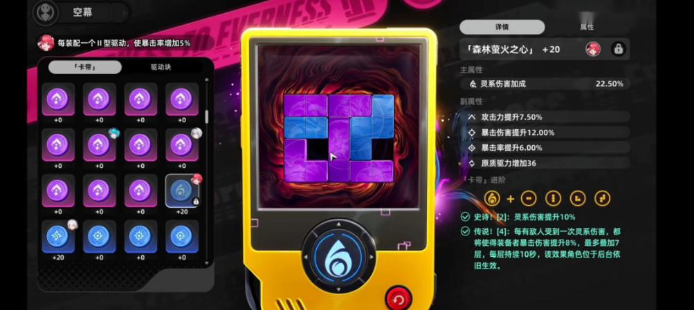 空幕在游戏里看起来,像一台掌上游戏机,里面分成两个部分,一个是卡带,一个是驱动。卡带是圆形的,负责提供套装效果,总共两片,装对了,就能触发对应的套装加成。驱动就是普通的属性装备,按照要求装上去,还能解锁两件史诗加两件传说的额外效果。两者缺一不可,少了哪个属性都会差一截。