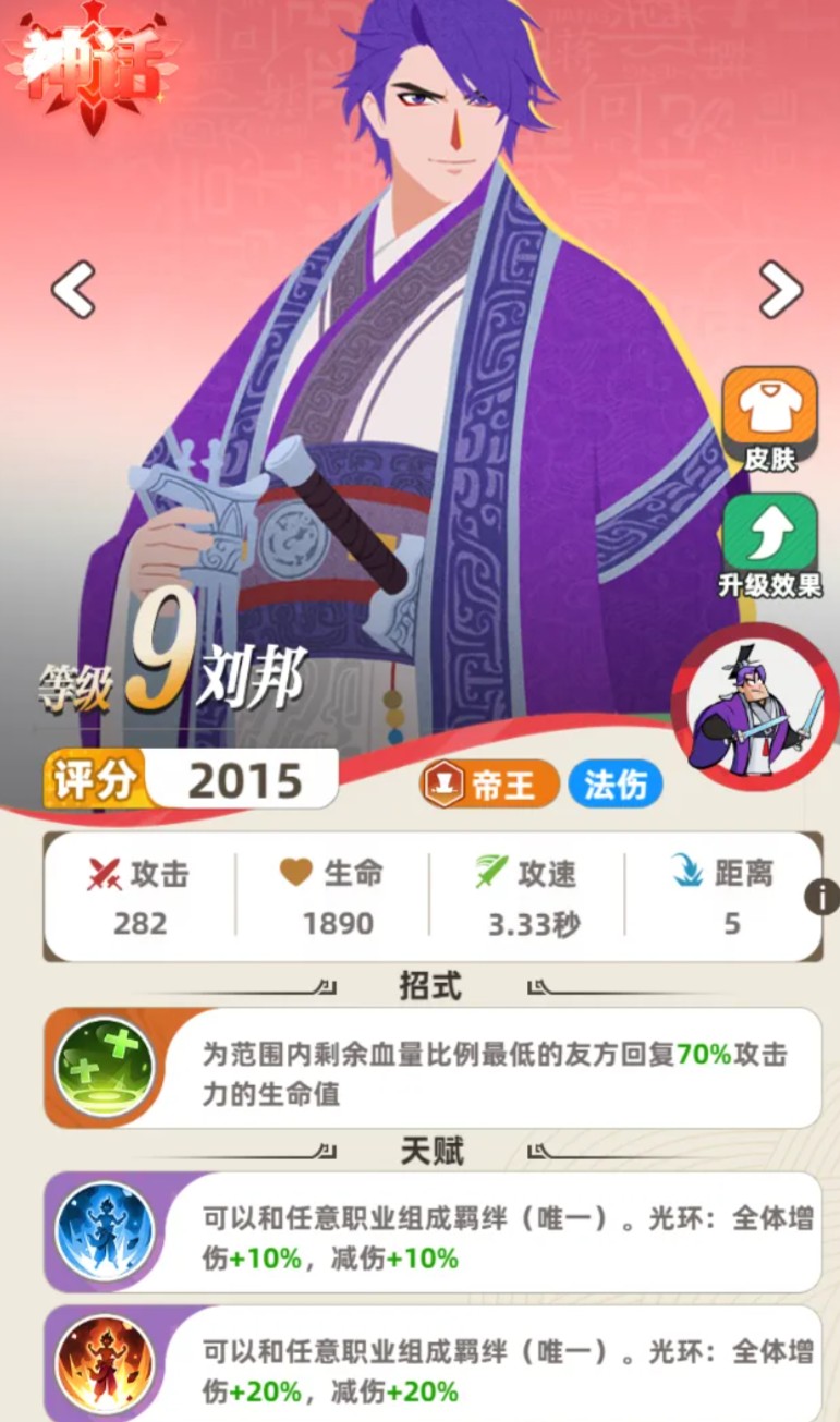 刘邦作为新手阶段不可替代的辅助型英雄,将在玩家达到6000杯段位后开放获取。其核心价值集中于9级质变——该等级触发全队增益机制:队友输出提升、承伤降低,并具备群体治疗能力。这一特性使其在常规对战、限时活动及高难度副本中均表现稳定。建议优先集齐资源将其升至9级,后续再按需推进至更高星级。