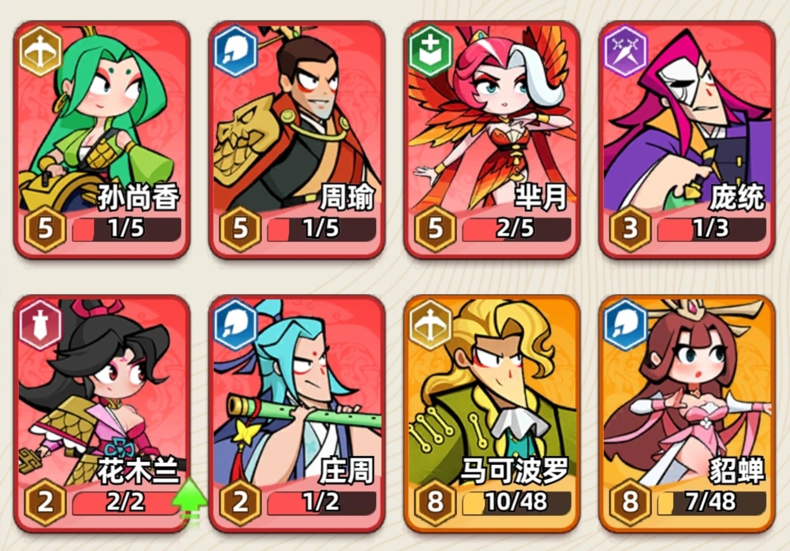 各职业均设有一张金色品质核心英雄,于800杯段位解锁,包括射手马可波罗、战士张飞、刺客兰陵王、谋士貂蝉、辅助鲁班。此类英雄在8级与12级存在关键属性跃升节点,可显著强化同职业阵容协同效果。若资源充裕,建议将其与前述输出英雄搭配培养;若资源有限,则优先完成其中一位的星级突破,即可获得可观战力加成。
