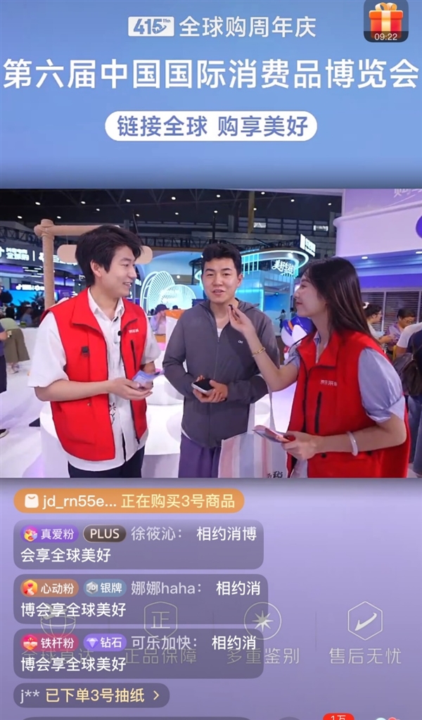 为打通线上线下消费场景,京东全球购以“云游消博・全球好物直达”为主题开展专场直播。青春采销团队现场逛展、实景试用、发放专属福利,带领线上观众沉浸式打卡3C、酒水、美妆、时尚等多品类展区。整场直播累计观看人次达34万,直播间新增粉丝突破万人,有效实现流量转化与用户沉淀。