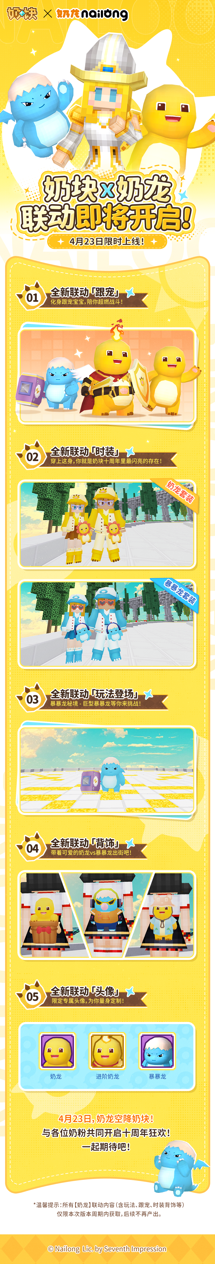奶龙与奶块十周年惊喜联名!在狂欢的日子里,你可以把可爱的奶龙宝宝带回家,还有萌翻天的奶龙时装和背饰,可爱无敌!