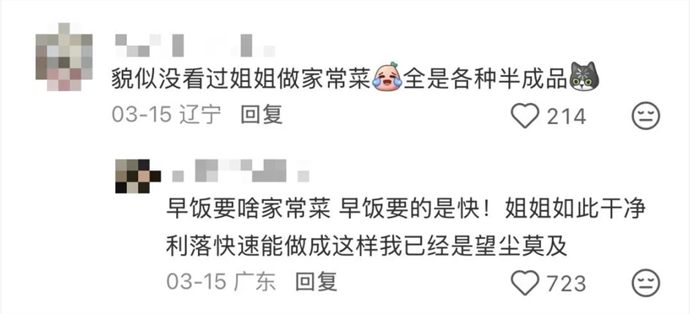 这种全能劳模式的母亲形象,曾精准击中了大众对所谓“传统好妈妈”的想象:勤劳、能干、无私奉献,把一家人的饮食起居打理得妥妥帖帖。网友开始羡慕有一个像她这样的妈妈,评论区里更是此起彼伏地“听取一片‘妈’声”。
