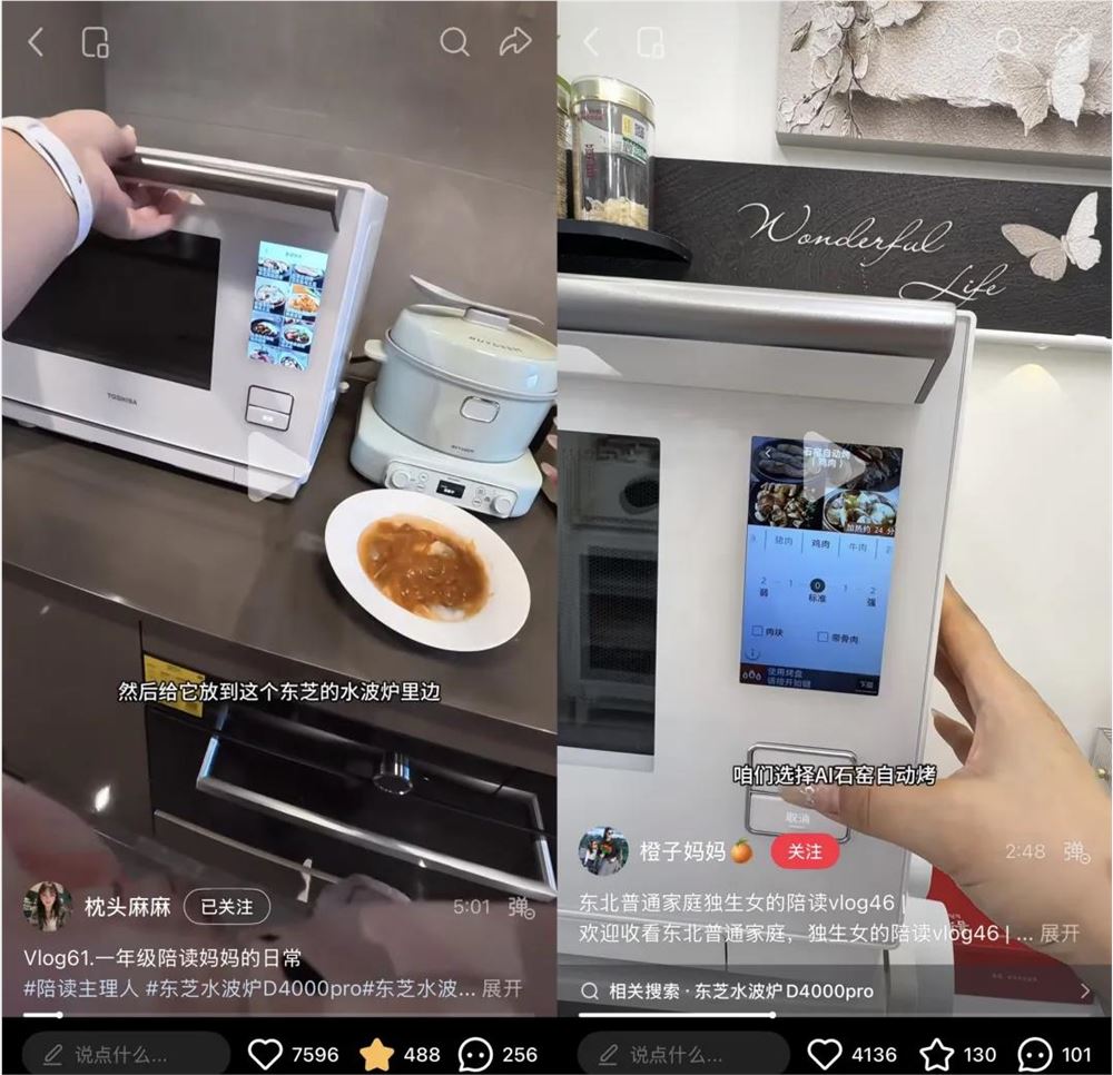一些品牌方也看准了陪读妈妈的带货潜力,进行批量投放。以某厨房家电品牌为例,近期与至少两位陪读妈妈的账号达成合作,其评论区均出现了该电器的产品信息,主推自动化蒸烤,将“不费妈”贯彻到底。