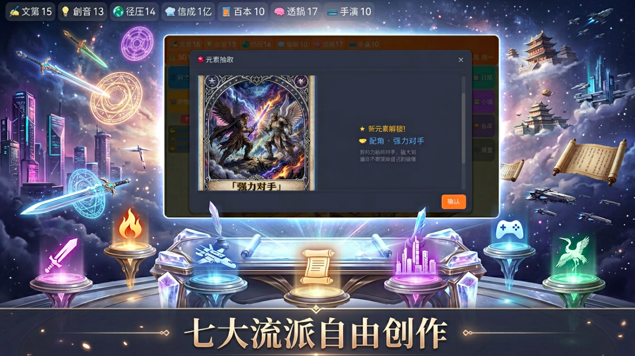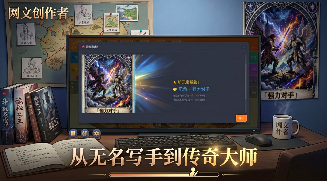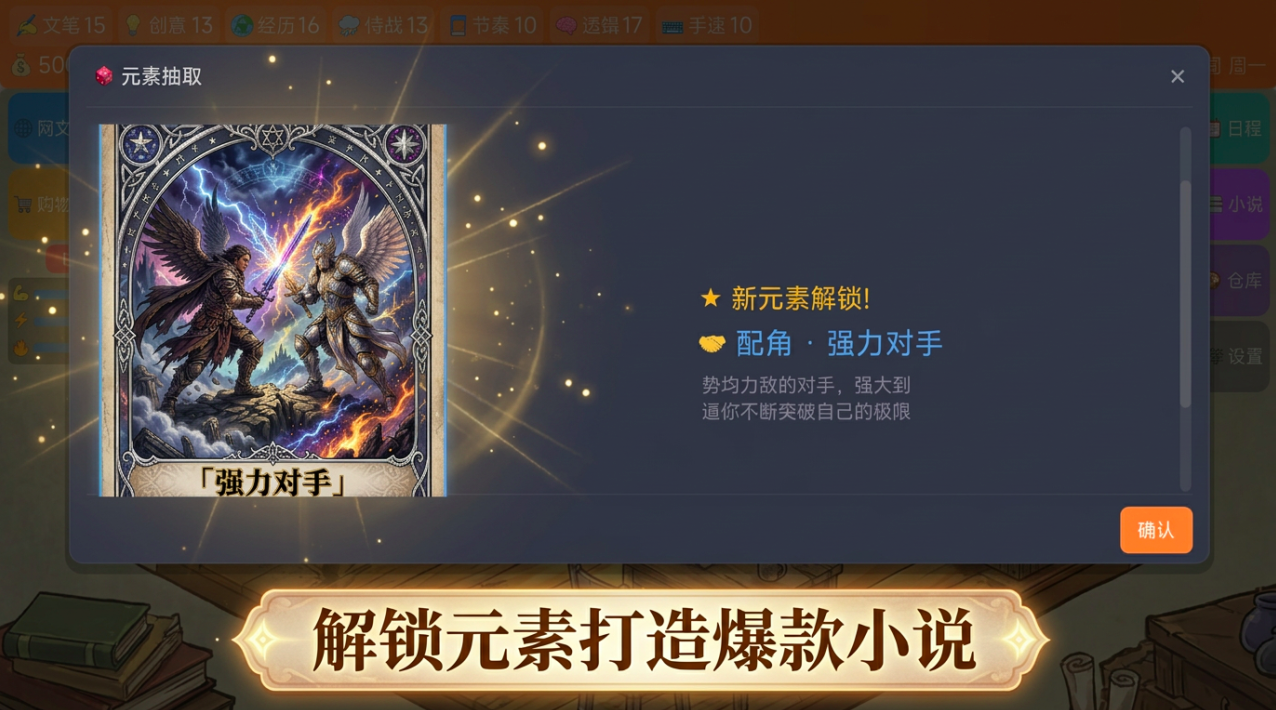 游戏构建了高度拟真的小说生产系统:涵盖选题策划、人设搭建、情节编排、节奏把控等全流程环节。内置数十种经市场验证的爆款小说核心元素,如“废柴逆袭”“系统流”“群像成长”“高密度反转”等,均以可组合的模块化卡牌形式呈现。元素池持续更新,玩家需兼顾策略搭配与随机抽取机制,方能高效合成具备传播潜力的新作品。