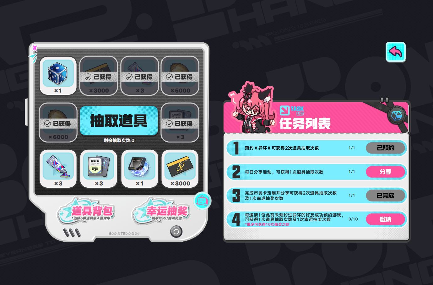道具集市则以任务驱动形式发放抽卡次数,玩家可通过预约游戏、每日分享活动页面、完成并发布市民卡、邀请未预约好友成功预约等方式积累抽取机会。每次抽取可获得包括捏造骰子、A级弧盘、方斯、甲硬币、资深猎人攻略、无彩染剂在内的多种实用道具。每位玩家最多可领取6种不同道具,所有道具均为正式服可用资源。